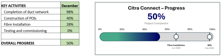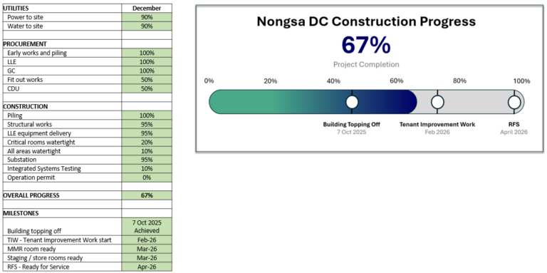 - Key milestones remain on track: Energisation is in progress, the first MMR and Data Hall are near completion to host Tenant Improvement Work in February and Ready for Service (RFS) in April. We’re committed to delivering a robust, future-ready solution.